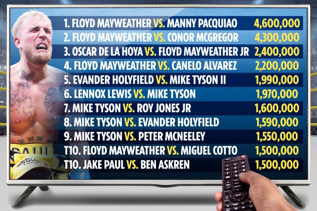 Jake Paul and Ben Askren’s fight cracking the top 10 boxing PPV buys of all time