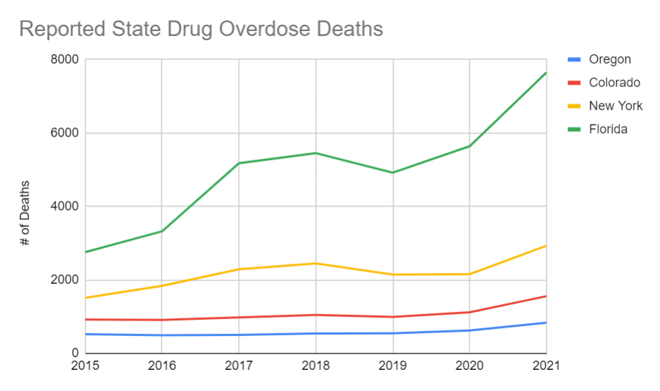 From 2015 to 2021, Oregon showed an increase of about 61% in overdose deaths. Florida however, showed a significant 178% increase over time. Florida’s drug policies don’t include decriminalization statewide. Furthermore, Colorado, which has decriminalized marijuana for recreational and medical use, showed a 69% increase, while New York, which has newly decriminalized marijuana for both uses as well, showed a 94%. The overall U.S. percent increase in overdose deaths since 2015, is about 99%.